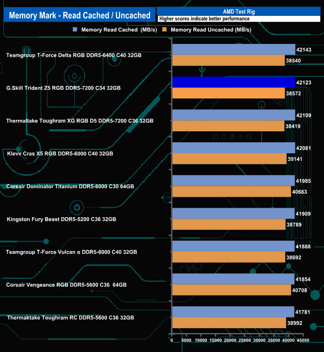 The drive sits in second place in the Memory Mark Read Cached chart with a result of 42,123MB/s. However, its Read Uncached result of 38,572MB/s is the fastest of the group of modules tested here.