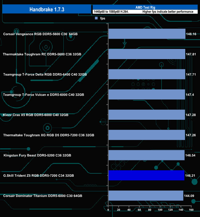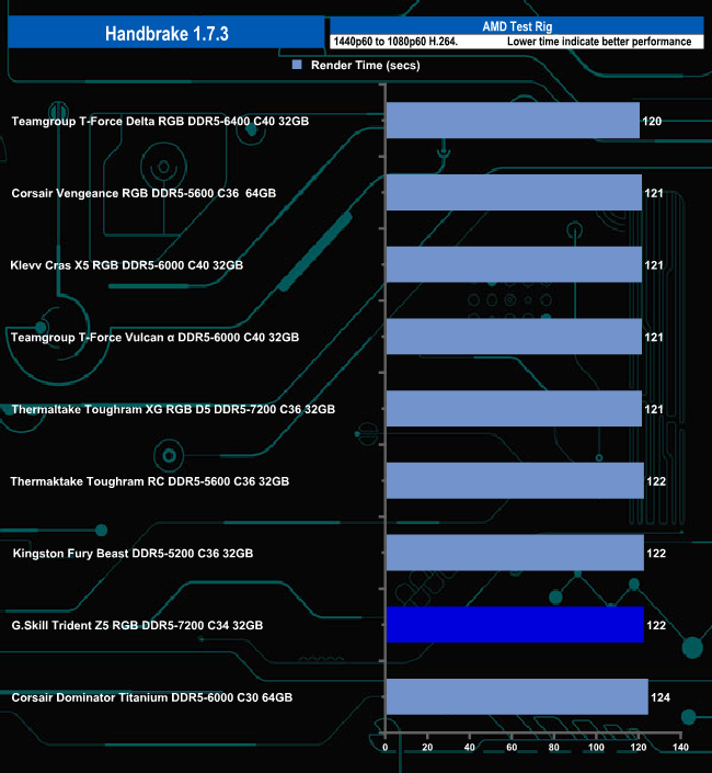 On paper G.Skill's Trident Z5 RGB 7200 C34 should be faster than Treamgroup's T-Force Delta RGB 6400 C40 but in this test the G.Skill memory takes two seconds longer to complete the job than the Teamgroup kit.