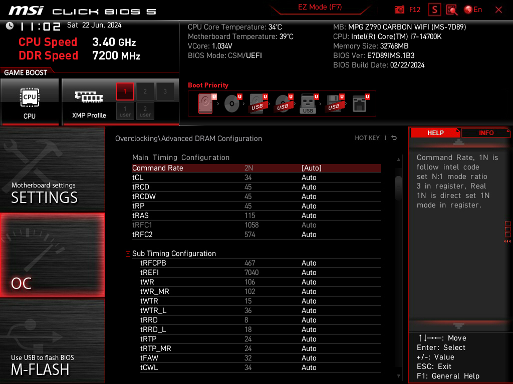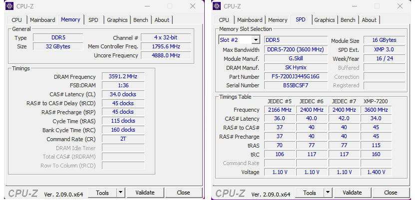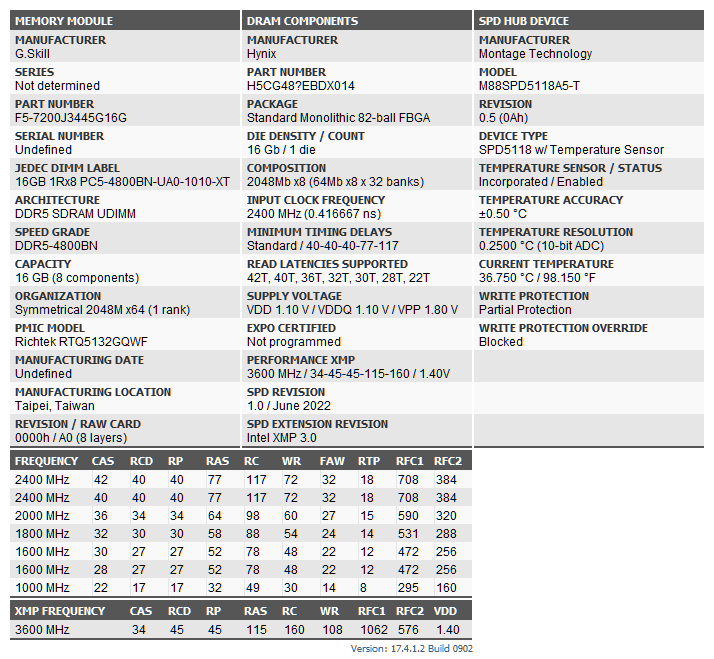 The memory runs at DDR5-4800 with timings of 40-40-40-77 natively with the single XMP 3.0 profile supporting DDR5-7200 with 34-45-45-115 timings at 1.4V.