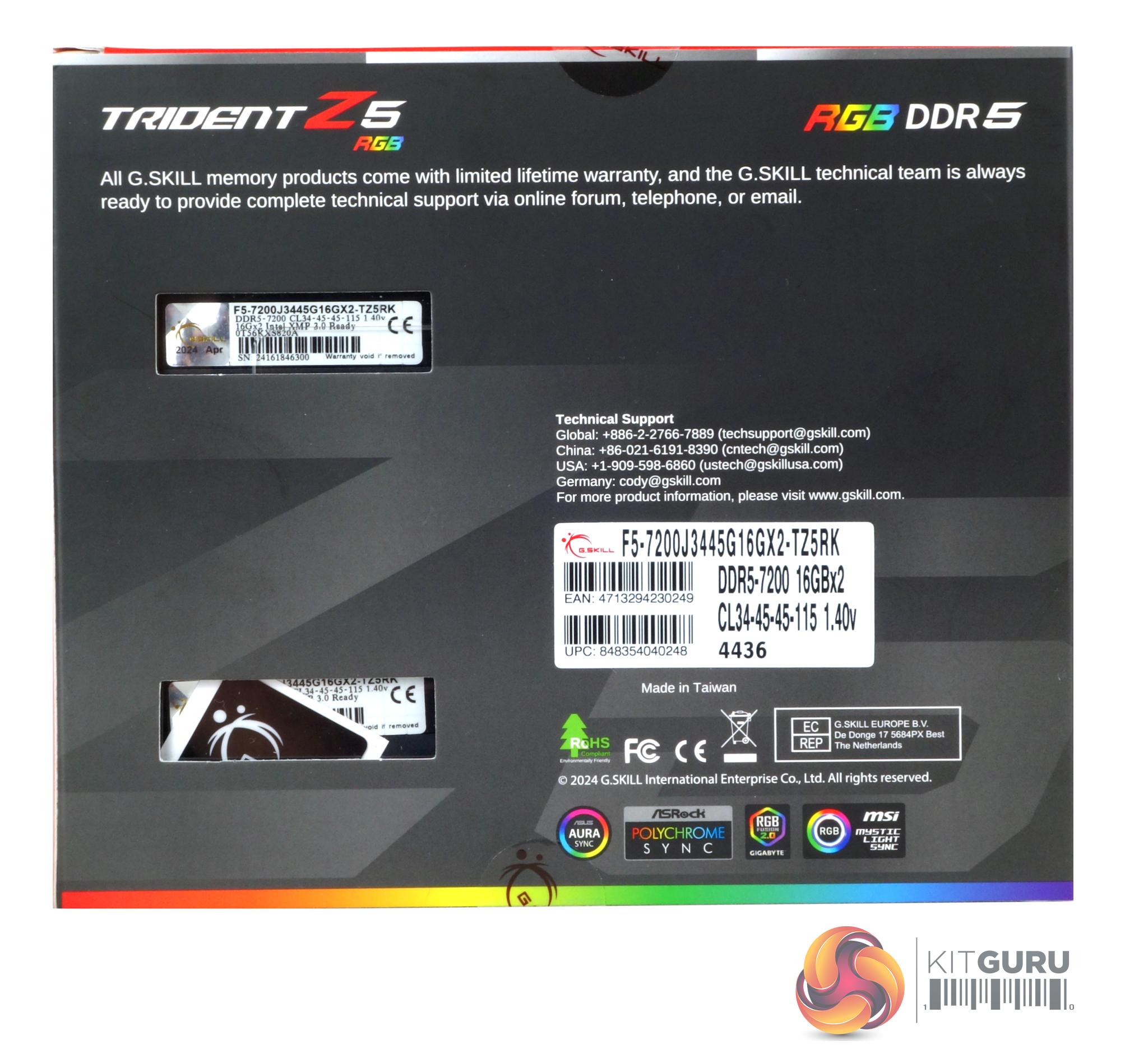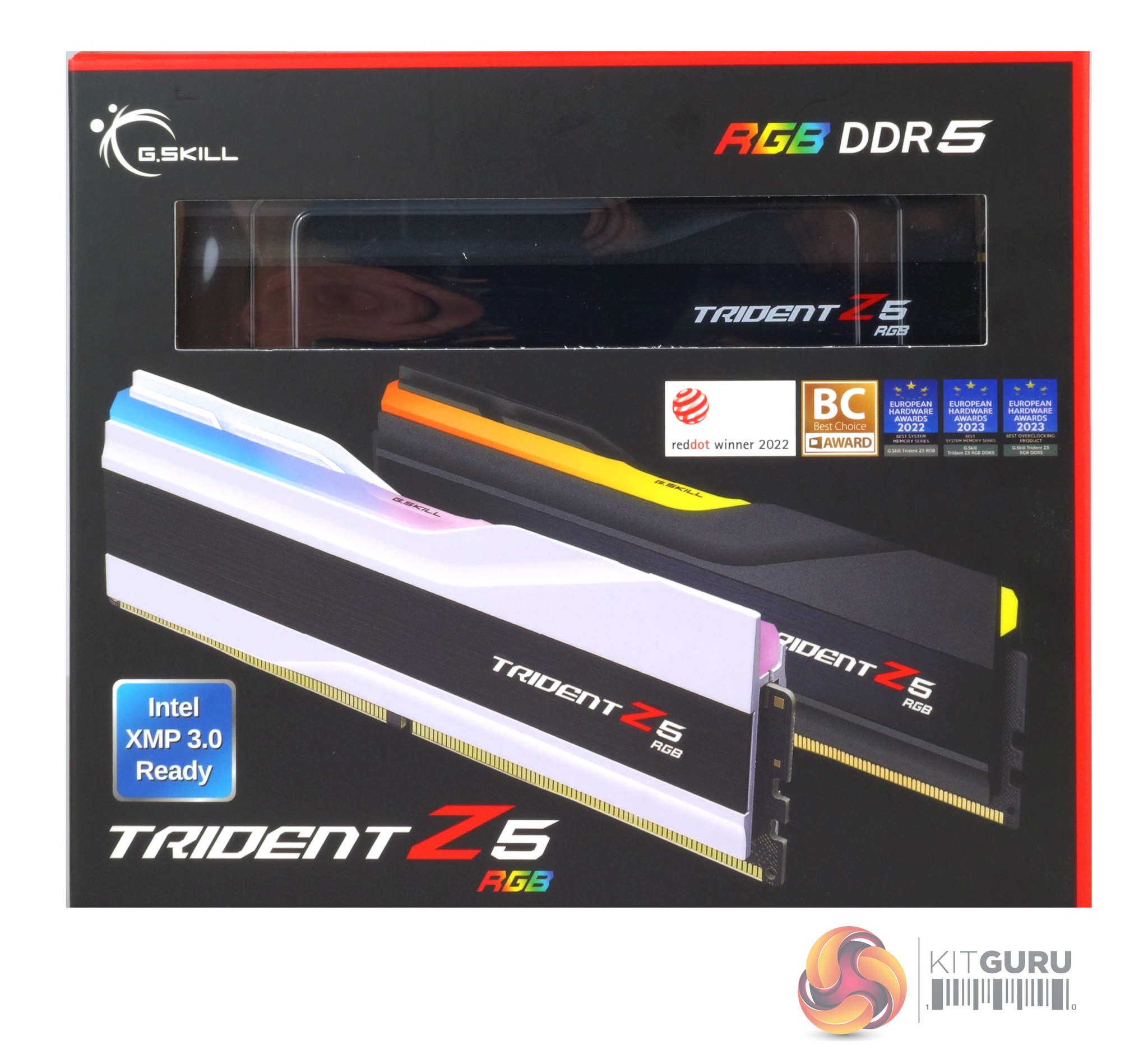 The front of the box that the memory comes in has a cut-out near the top, allowing you to see part of one of the modules. Below this are two illustrations of what the memory looks like. The bottom left of the box is home to the Intel XMP 3.0 Ready” sticker along with the Trident Z5 RGB branding. The rear of the box has two more cutouts (top and bottom) which lets you see the SKU sticker attached to the module. To the right of the bottom cut-out is the product sticker that displays the module density, configuration and what the XMP profile provides.