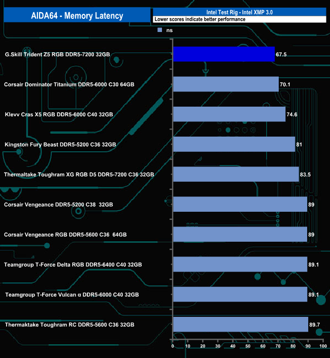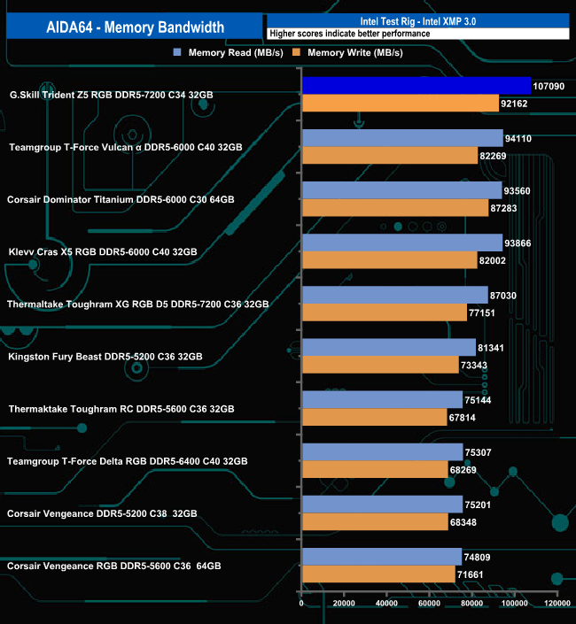 In the AIDA64 Memory Bandwidth test, the Trident Z5 RGB DDR5-7200 sits on top of the results chart by quite some margin for both reads and writes.