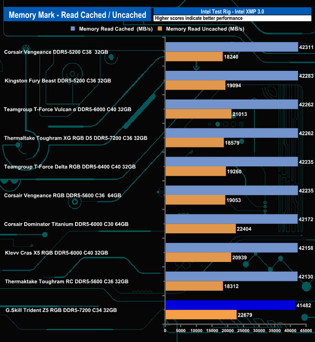 In the Memory Mark Read tests the Trident Z5 RGB 7200 doesn't do so well in the Memory Read Cached test as it sits in last place in the results chart. However, the Uncached Read figure of 22679MB/s is the fastest of the modules tested here.
