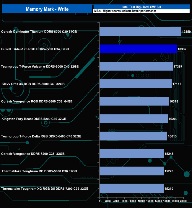 In the Write test, the Trident Z5 RGB 7200 sits in second place behind Corsair's Dominator Titanium 6000 C30 modules.
