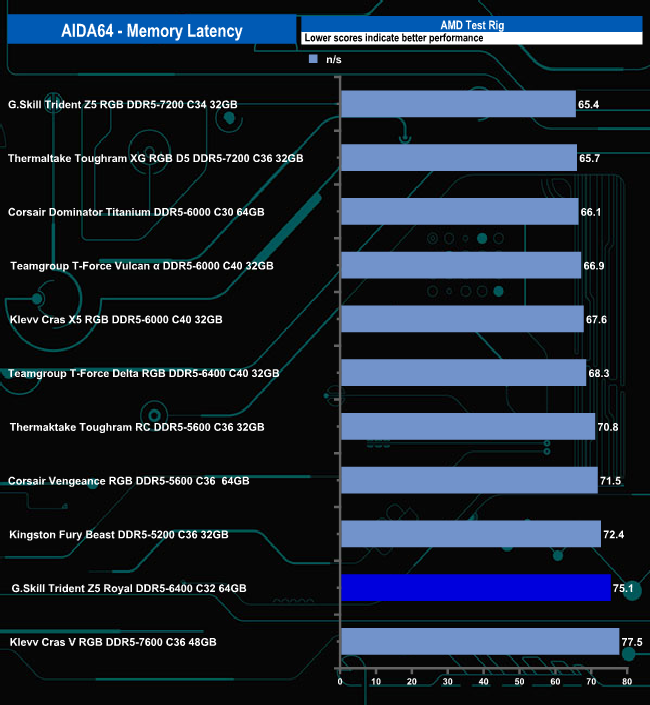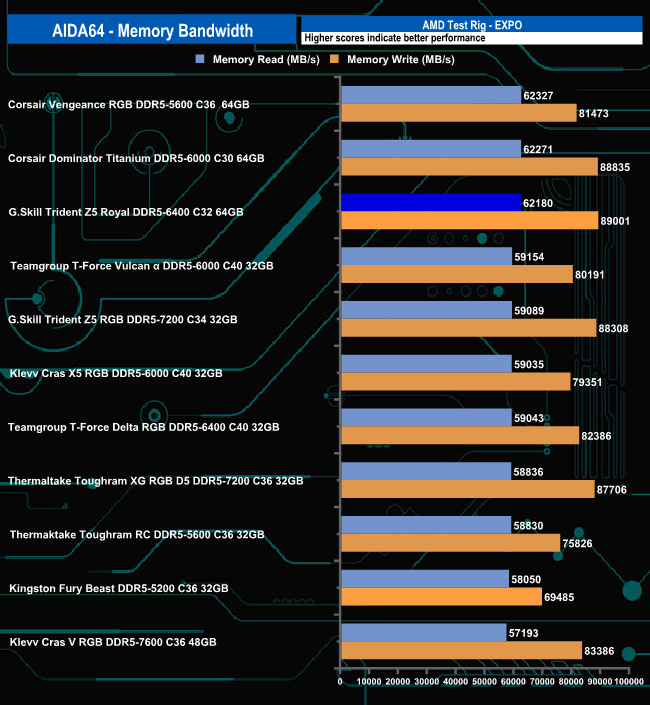 With a read result of 62,180MB/s, the G.Skill Trident Z5 Royal 6400 sits in third place in our results graph but its write result of 89,001MB/s is the fastest of the DDR5 sets we've tested to date.