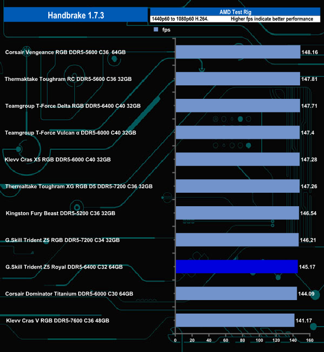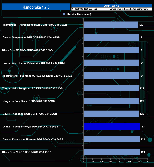 In the Handbrake test, G.Skill's Trident Z5 Royal 6400 sits near the bottom of the results chart but in reality, there is hardly anything in it between it and Corsair's Vengeance RGB DDR5-5600 that sits on the top of the table.