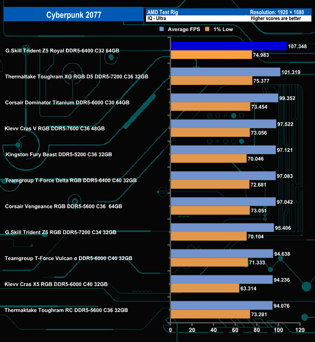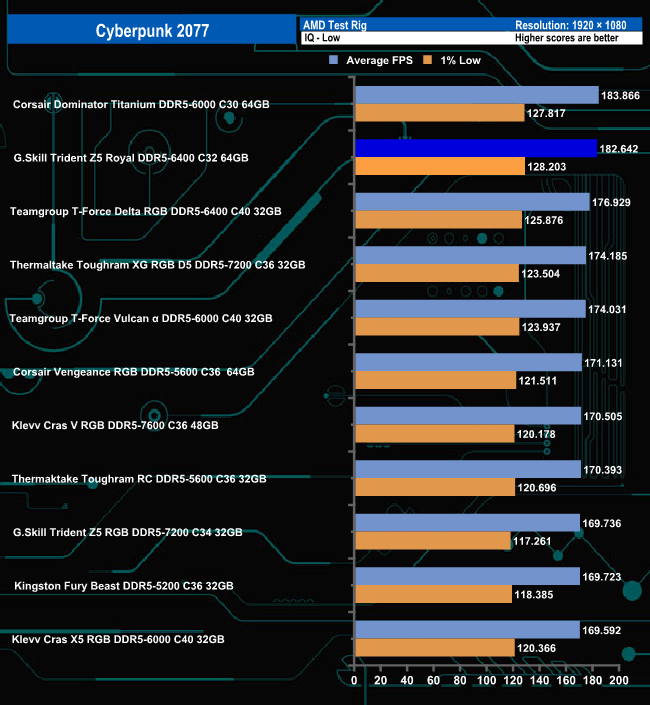 The Trident Z5 Royal 6400 performs well in the Cyberpunk 2077 under both image quality settings. It's the fastest we've seen to date using Ultra settings and oddly drops to second fastest when using the Low setting.