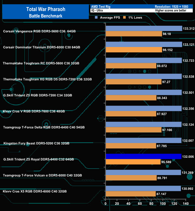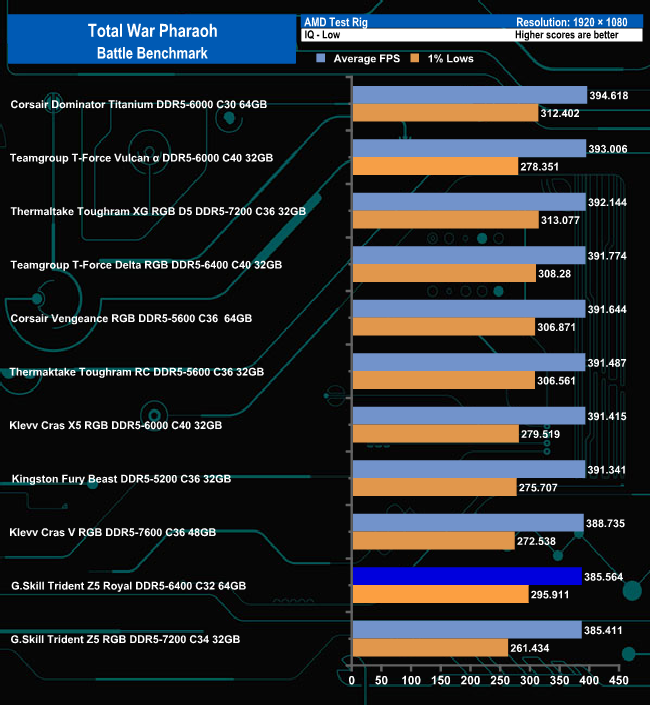 Although the G.Skill's Trident Z5 Royal 6400 sits near the bottom of both the Ultra and Low image quality graphs for average fps in the Total War Pharoah – Battle benchmark, its 1% Low figure for both would see it in the top five modules for both graphs.