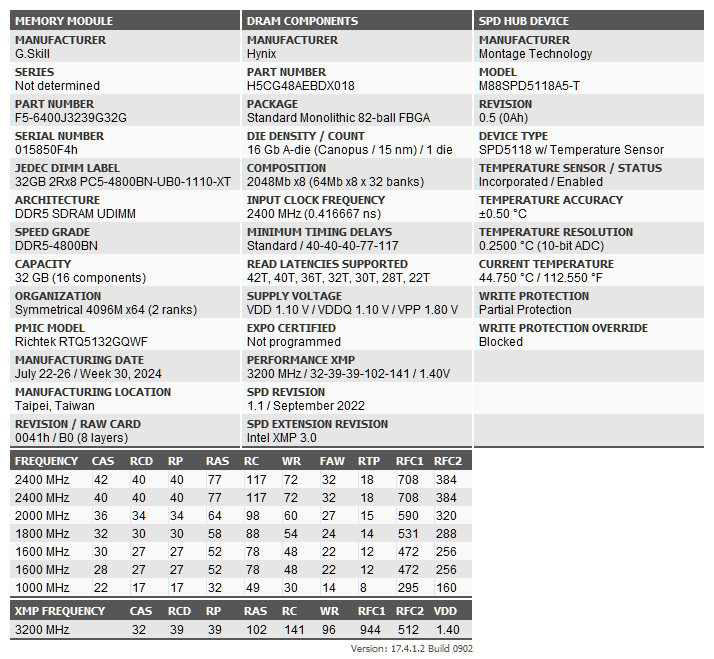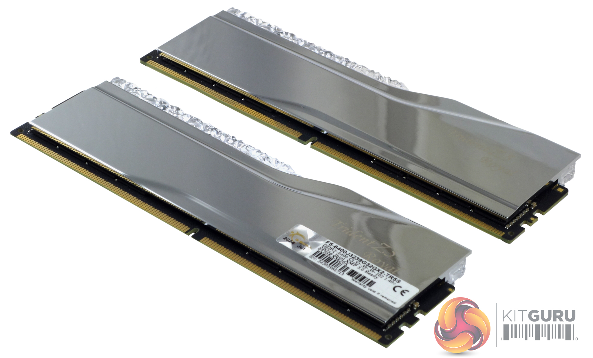 Built on a 10-layer PCB the modules are a dual-rank design with eight 2 GB SK Hynix A-Die ICs (H5CG48AEBDX018) on each side along with a Richtek RTQ5132GQWF power management IC (PMIC). The CNC-cut aluminium heat speader cover is electroplated with a mirror finish in a choice of two colours, silver (the review sample) and a very fetching gold finish. Finishing off the already impressive-looking module is a crystalline light bar covering the LEDs.