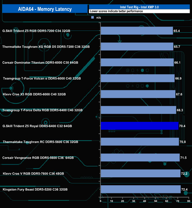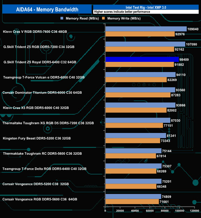 In the AIDA64 Memory Bandwidth test, G.Skill's Trident Z5 Royal DDR5-6400 sits in third place behind the Trident Z5 RGB DDR5-7200 by quite some distance with its read performance, but the write performance is much more closely matched.