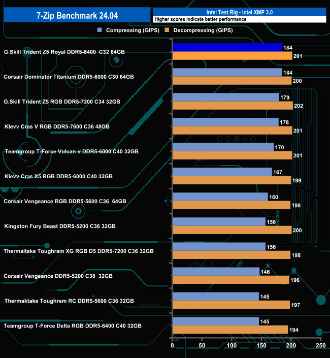 In the 7-Zip Compressing benchmark, the G.Skill Trident Z5 Royal 6400 sits on top of the table thanks to its very, very slight advantage in the Decompressing test over Corsair's Dominator Titanium 6000.