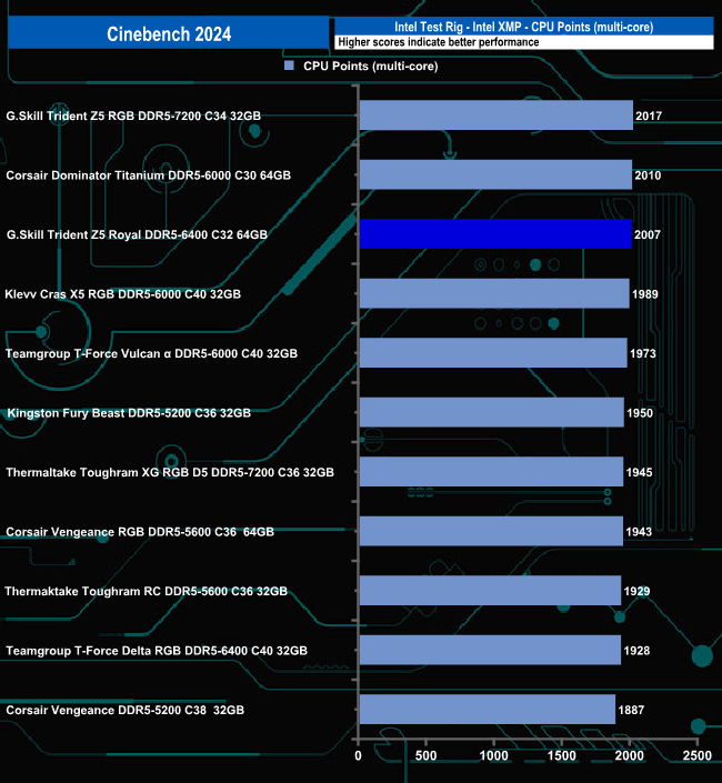 The G.Skill Trident Z5 Royal 6400 sits in third spot on the Cinebench 2024 results chart behind G.Skills Trident Z5 RGB 7200 and Corsair's Dominator Titanium 6000.