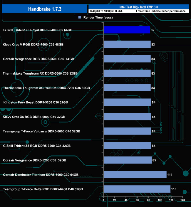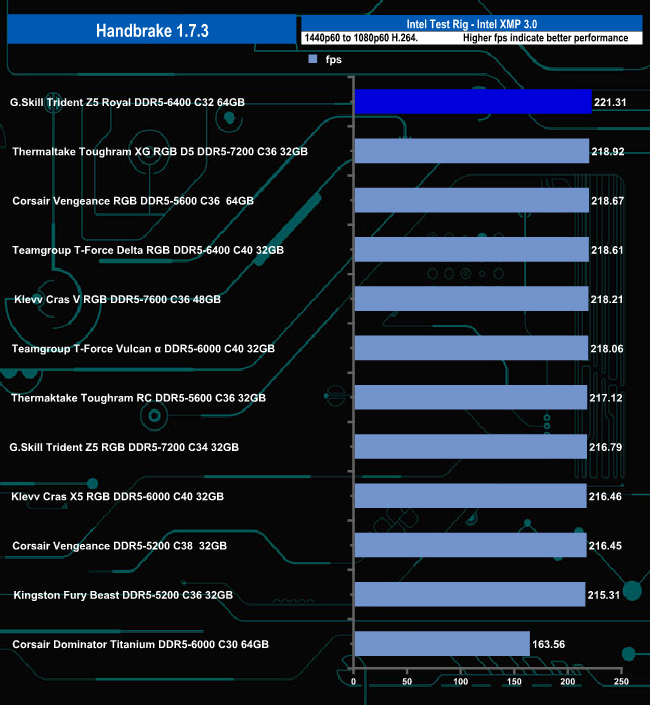 In the Handbrake test, the G.Skill Royal memory set sits in the top spot but truth be told there's hardly anything in it between the first and eleventh place on the results chart.