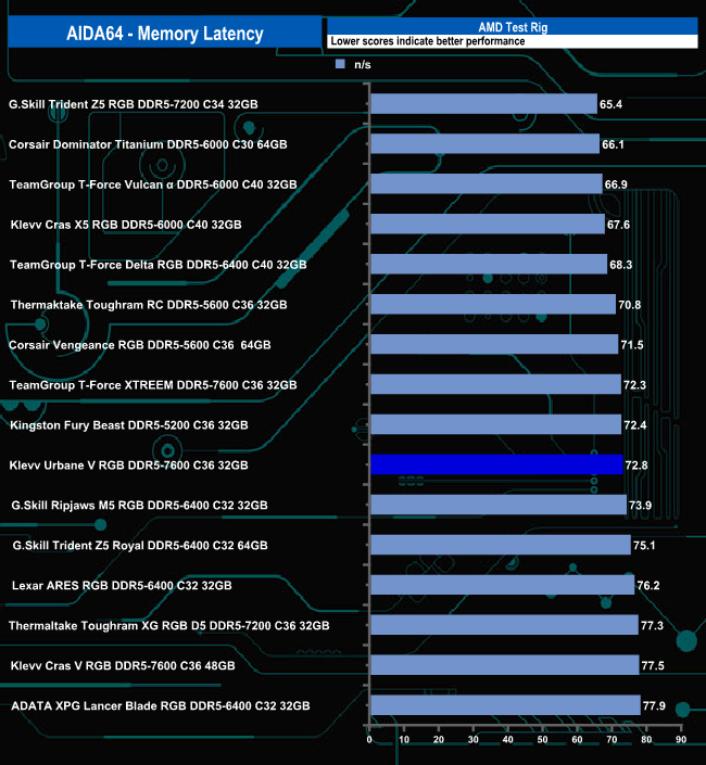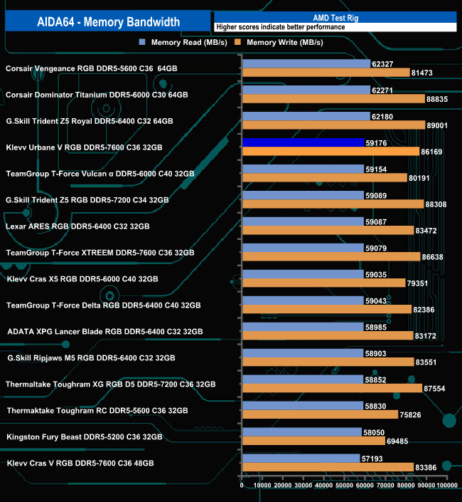 When tested with the AIDA64 memory benchmark the 32GB kit of Klevv's Urbane V RGB 7600MT/s produced a read figure of 59,176MB/s, a result which places the modules in the fourth place in the results chart. However, its write result of 86,169MB/s is only the sixth fastest we have seen to date in this test.