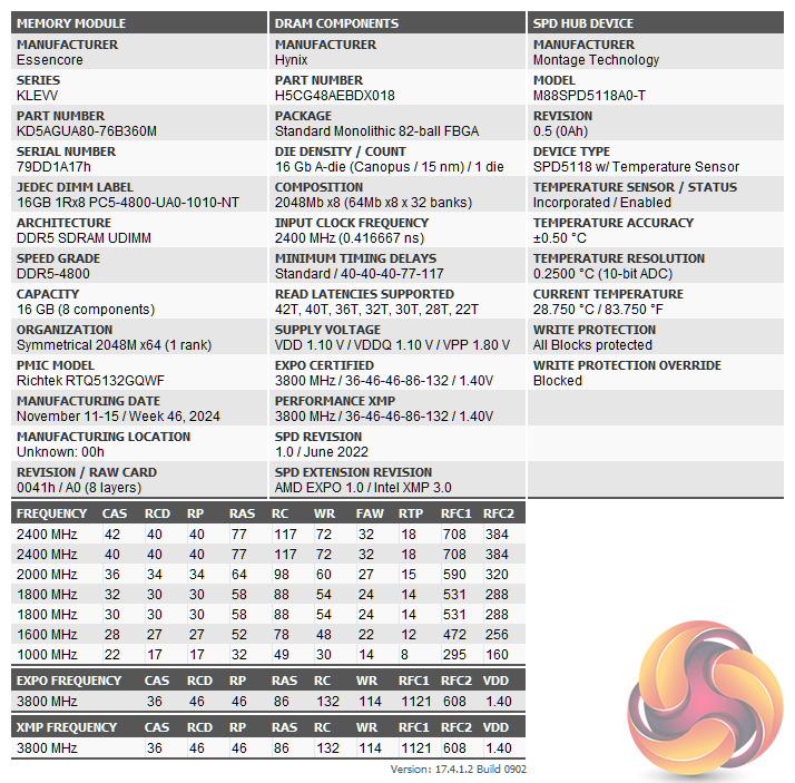 Built on a 10-layer PCB, the modules are a single-rank design, under the heatsink, there are eight 2GB SK Hynix chips (H5CG48AEBDX018) along with a Richtek RTQ5132GQWF power management IC (PMIC).