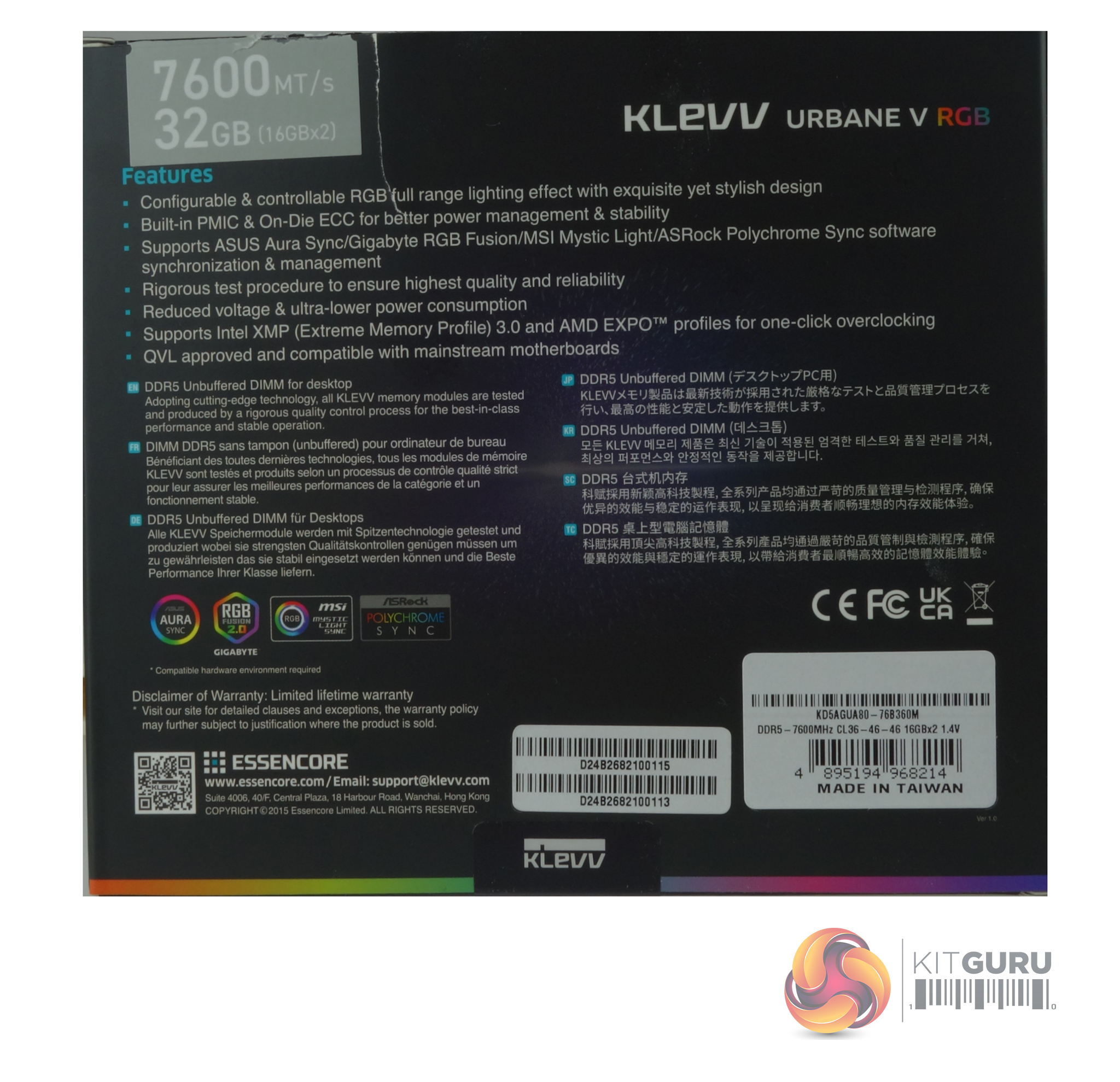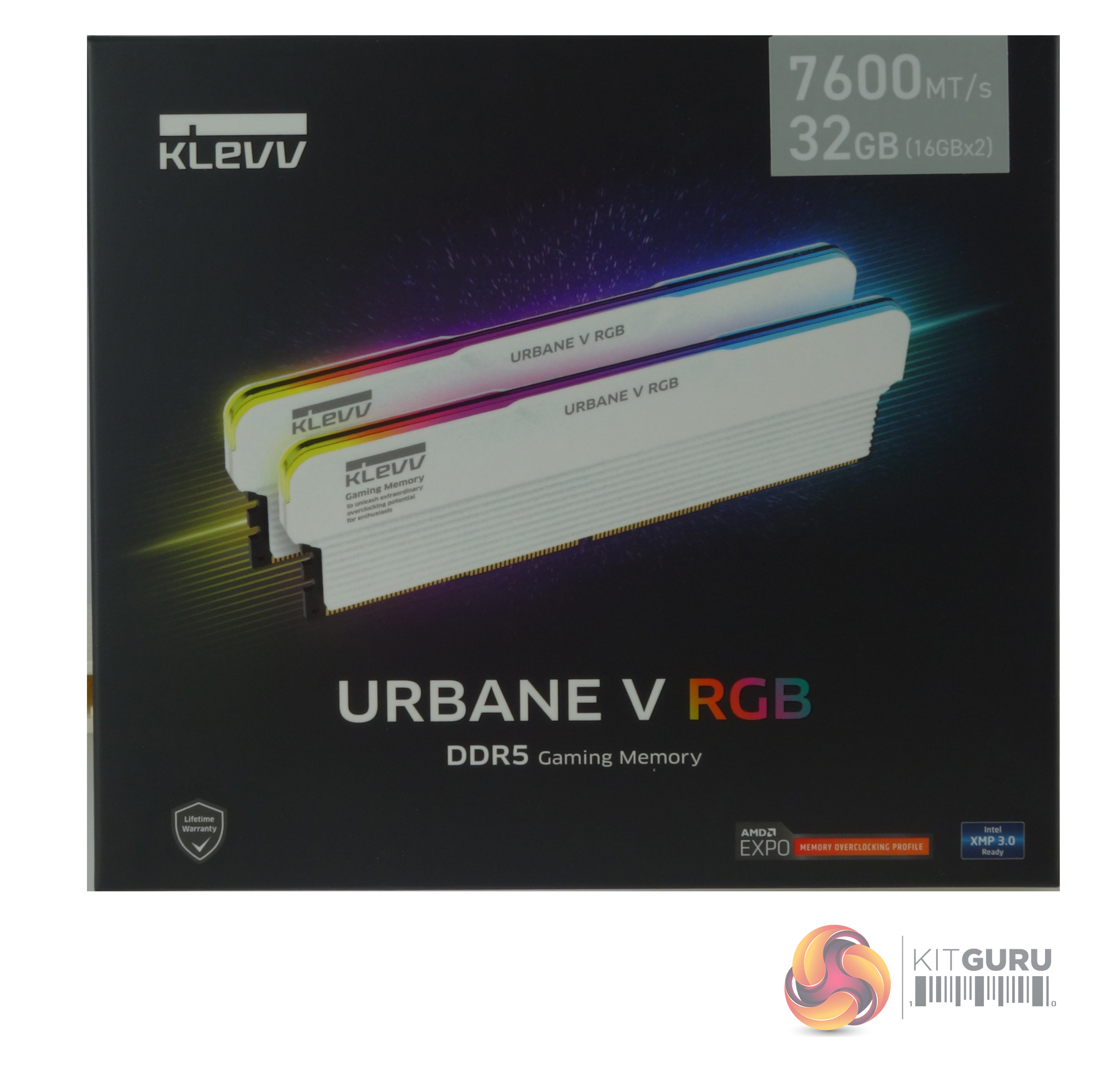 The front of the box has a good clear image of what the memory modules look like including working RGB. At the top right of the box is a sticker displaying the memory speed and the kit capacity (in this case 7600MT/s and 32GB). The bottom left of the box has an icon displaying that the memory comes with a lifetime warranty, while the bottom right has the icons for Intel XMP and AMD EXPO support. At the top left of the rear of the box is the other end of the speed and capacity sticker. Below this is a small feature list, multilingual information about the modules and icons displaying the motherboard RGB systems supported; Asus Aura Sync, Gigabyte RGB Fusion 2.0, MSI Mystic Light Sync, and ASRock Polychrome Sync.