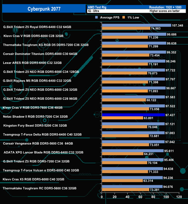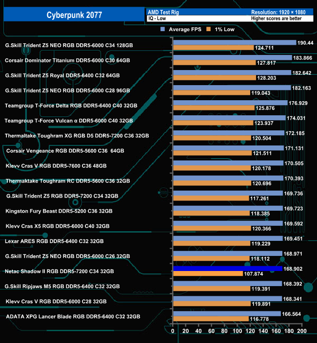 With the game quality settings set to Ultra, the Netac Shadow II sits in a lower mid position in the Cyberpunk 2077 results table. Switching over to low-quality settings, the memory drops to the lower half of the results chart.