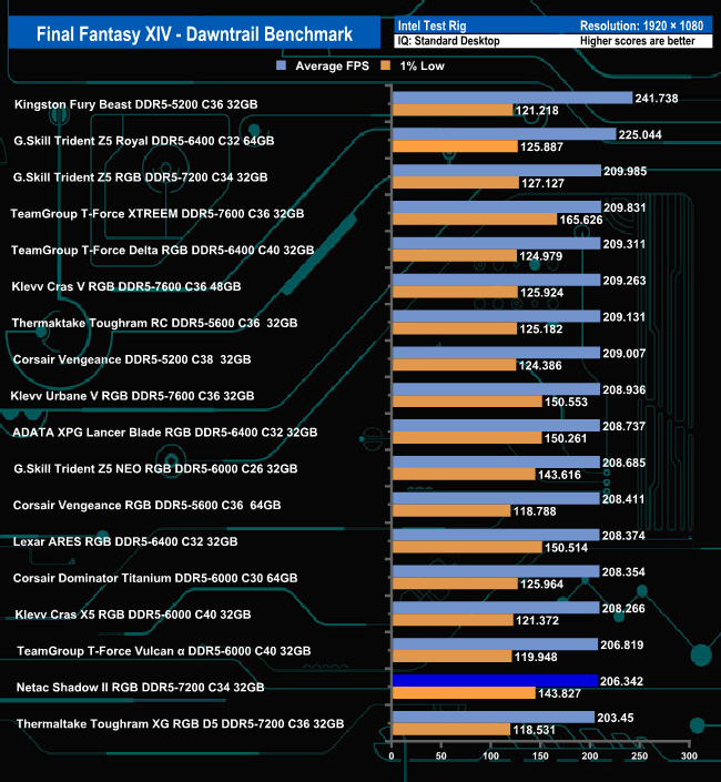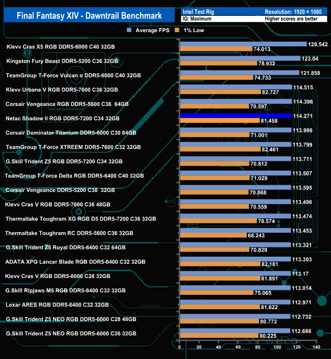 Using the maximum quality settings in the Final Fantasy XIV-Dawntrail benchmark, the Netac memory sits in sixth place, but the margins are slim from third position down. Backing off the quality settings sees the modules drop down one from last place in the table.