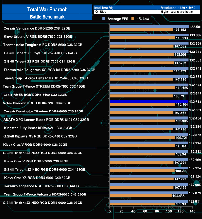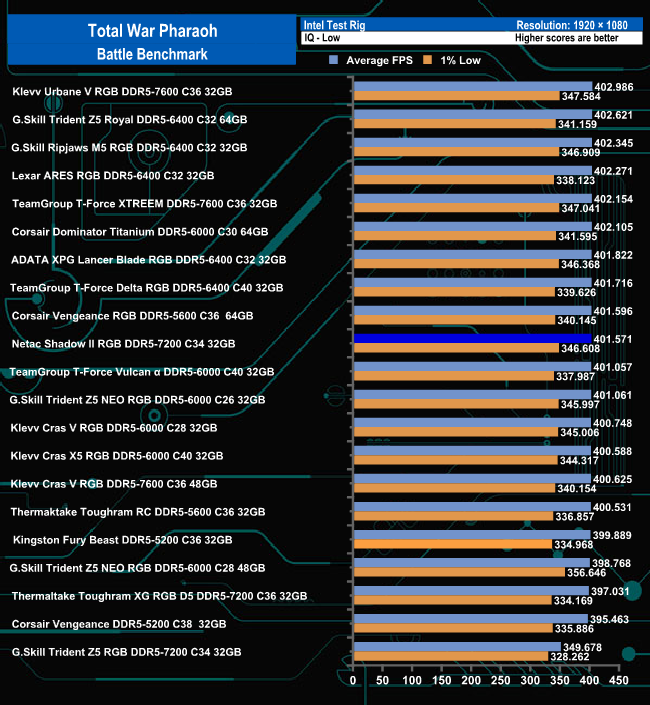 Using the Ultra quality settings, the Netac Shadow II RGB 7200MT/s memory ranks tenth in the Total War Pharaoh – Battle benchmark results chart. Easing off the quality settings to Low sees the memory still in tenth place. But in truth, there isn't much difference between any of the kits in the top half of either table.