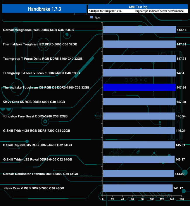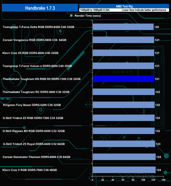The Handbrake transcoding test sees the ToughRAM XG RGB D5 slip into fifth place in the results table in between a pair of DDR5-6000 kits; Teamgroup's T-Force Vulcan α and the Cras X5 RGB from Klevv.