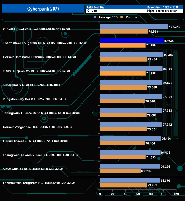 Thermaltake's ToughRAM XG RGB D5 average frame rate score of 99.638fps is good enough to put into second place in the results chart although its 1% low score isn't as good. Switching to test the memory at Low quality sees the memory drop down a couple of places in the chart.