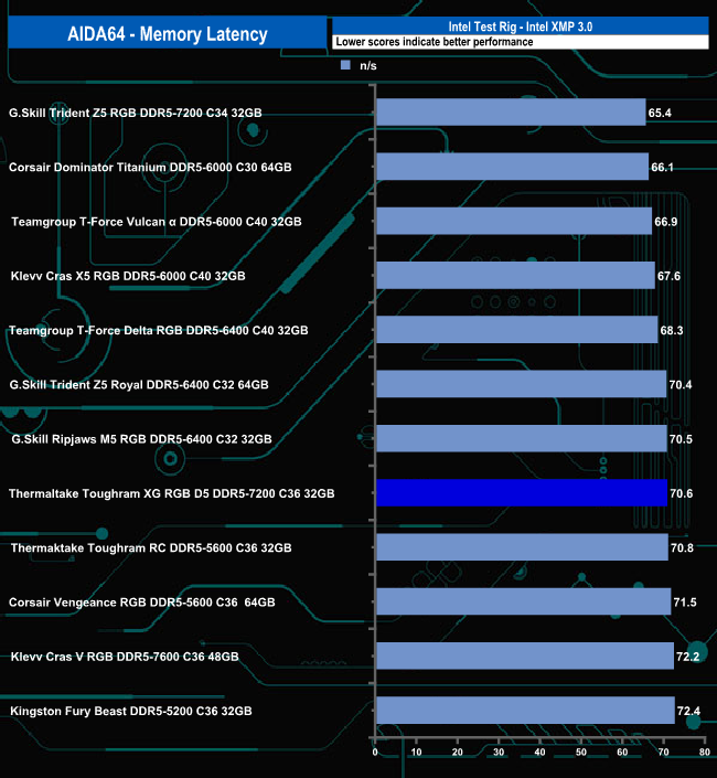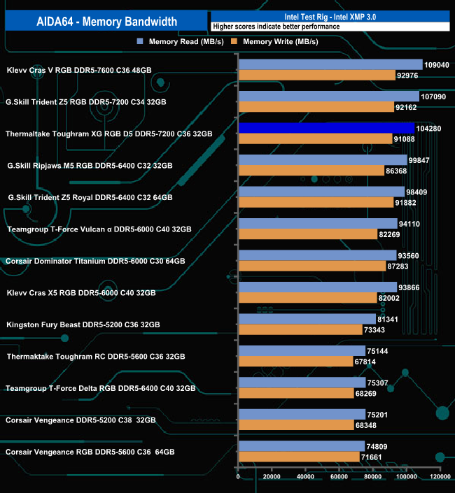 When tested with the memory bandwidth test in AIDA64, the DDR5-7200 model of Thermaltake's ToughRAM XG RGB D5 produced a read figure of 104,280MB/s which puts it below G.Skill'sTrident Z5 Royal RGB 32GB kit of 7200MT/s by some 2,810MB/s in the results table. However, the write performance comparison between the two kits is a lot closer.