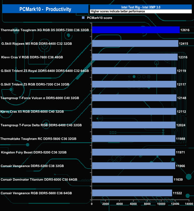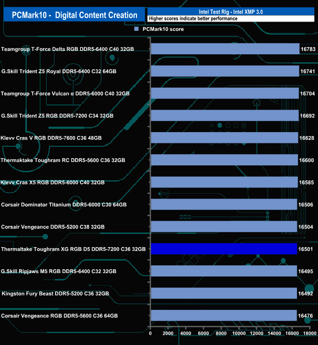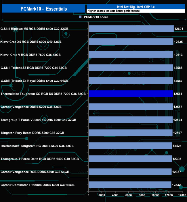 Thermaltake's ToughRAM XG RGB D5 memory produced a mix of results in the PCMark 10 benchmark. It's the fastest kit we've seen to date in the Productivity tests by a fair margin, middle of the pack in the Essentials test and in the Digital Content Creation group of tests, it ends up in the bottom half of the table.