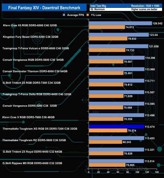 Using the Maximum quality settings the ToughRAM XG RGB D5 memory ends up in the bottom half of the table with its average fps result of 113.474. However, its 1% Low score is the second best we've seen to date in this test.