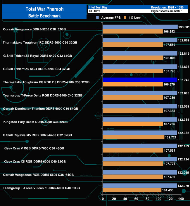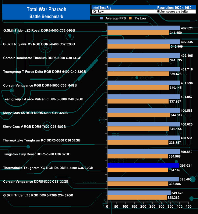 In the Battle benchmark of Total War Pharaoh, the ToughRAM XG RGB D5 memory sits in fifth place with the Ultra settings enabled and third from last with the Low settings on. But truth be told, for both tests there not much separating any of the modules.