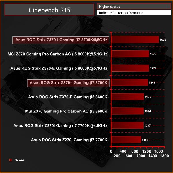 The i7-8700K’s revised clock speed saw the chip deliver a Cinebench score of exactly 1600cb – a modest but welcome leap from the board’s original result.