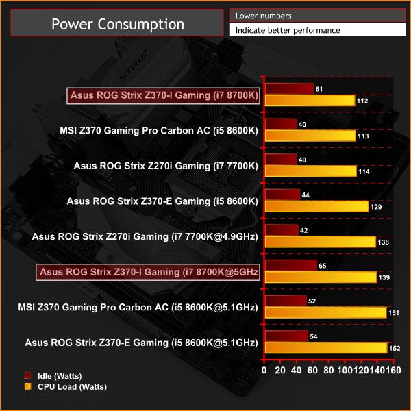 Overclocked tests saw the board’s idle figure only rise by 4W, and its load result of 139W is mid-table, and significantly lower than two of the ATX Z370 boards we’ve tested. It’s also just one Watt more than last year’s mini-ITX board required.