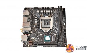 It’s no surprise that the Asus ROG Strix Z370-I Gaming is a good-looking product. The PCB is black and all of the ports, sockets and connectors use black too – so the trio of gunmetal grey heatsinks stand out even more.
