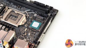 The audio gear sits beside the PCI-Express slot. It’s the same setup as the older Z270 board, which means the Realtek S1220A HD codec with 113dB SNR line-in and 120dB SNR line-out and Asus’ own SupremeFX shielding. There’s an OPA1688 operational amplifier, too, alongside an RC4580 dual operational amplifier, and the same Gold Series Nichicon audio capacitors are used again.