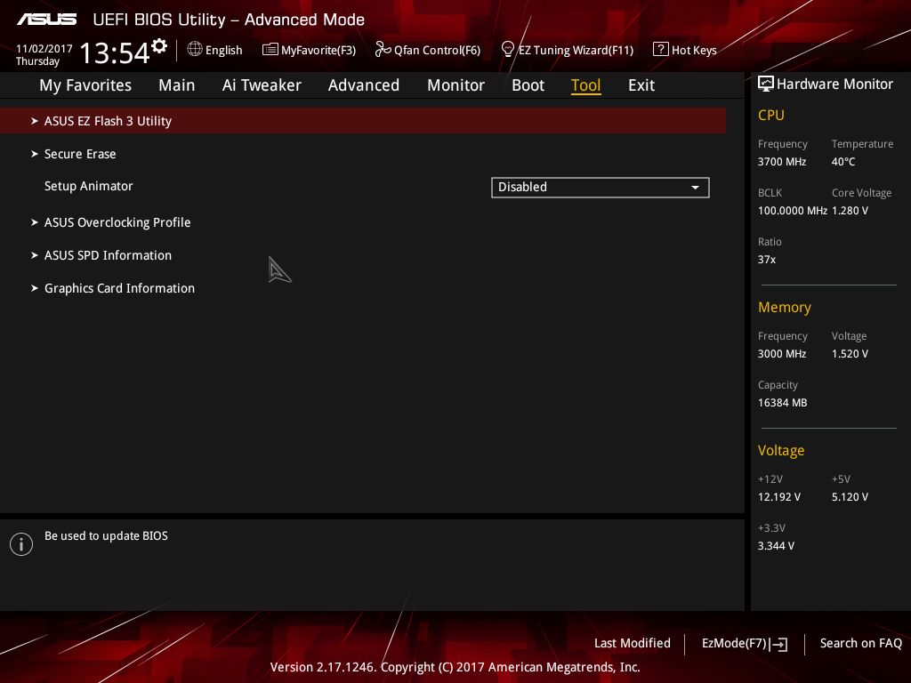The last menu provides tools like EZ Flash 3 and Secure Erase, and it’s also got the option to load overclocking profiles. Oddly, this is also where GPU information can be found.