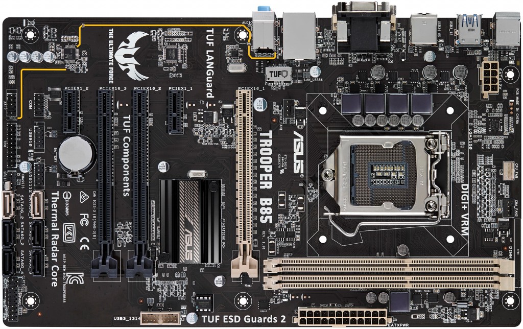 Like all Asus TUF-series motherboards, the Trooper B85 is built with military-certified components, such as Japanese-made 10K black metallic capacitors (with enhanced temperature endurance ang longer lifespan), TUF MOSFETs and TUF’s chokes that are manufactured using high-grade anti-oxidization materials.
