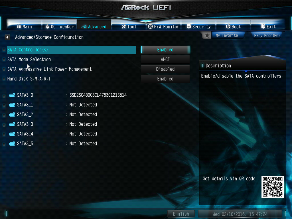 The Storage section lets you configure the Intel SATA chipset, and also which mode each detected storage device will operate in.