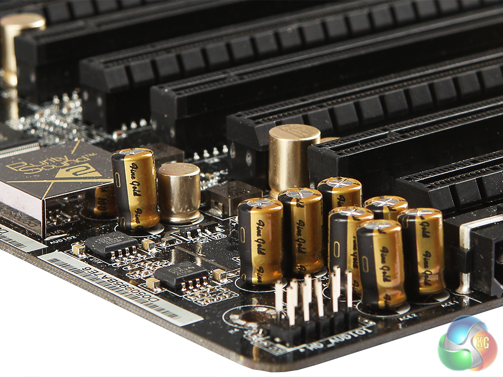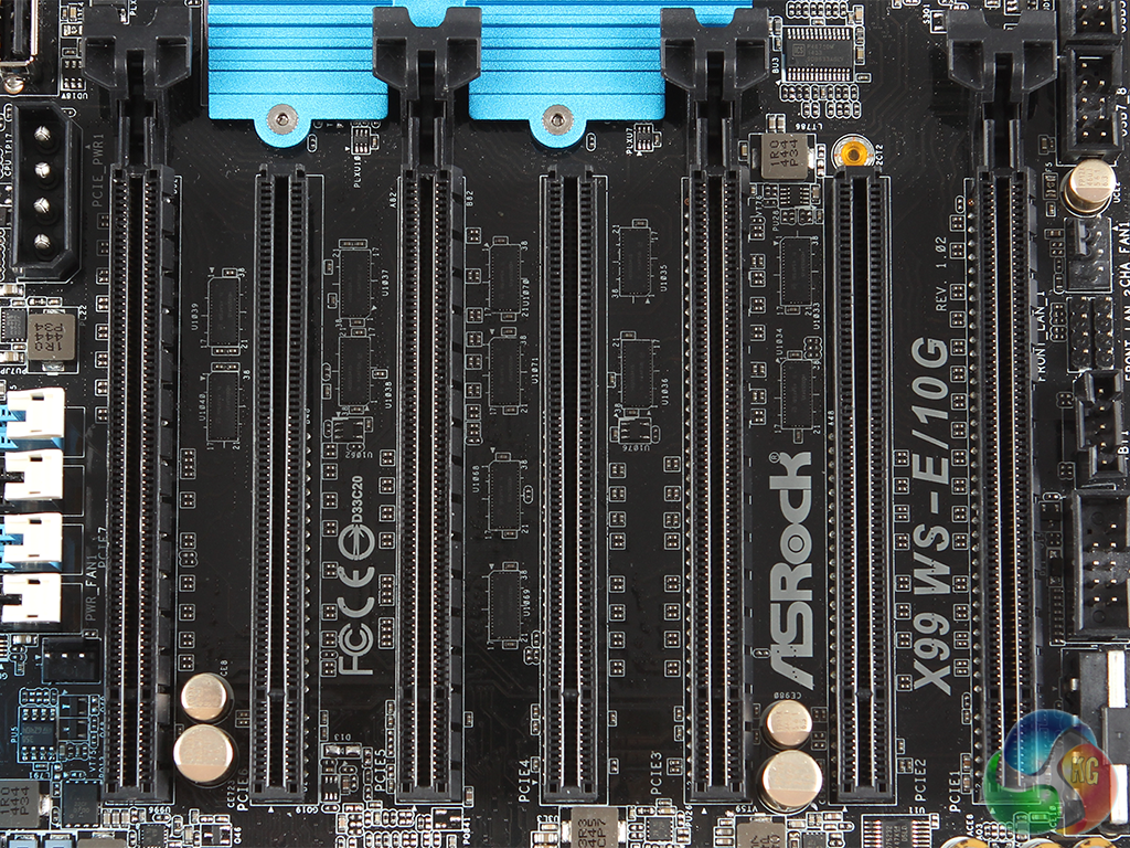 ASRock has alternated these slots between 16 and 8 lanes, with four of the former and three of the latter. The SLI bridges are designed to fit with the spacing of the 16-lane slots.