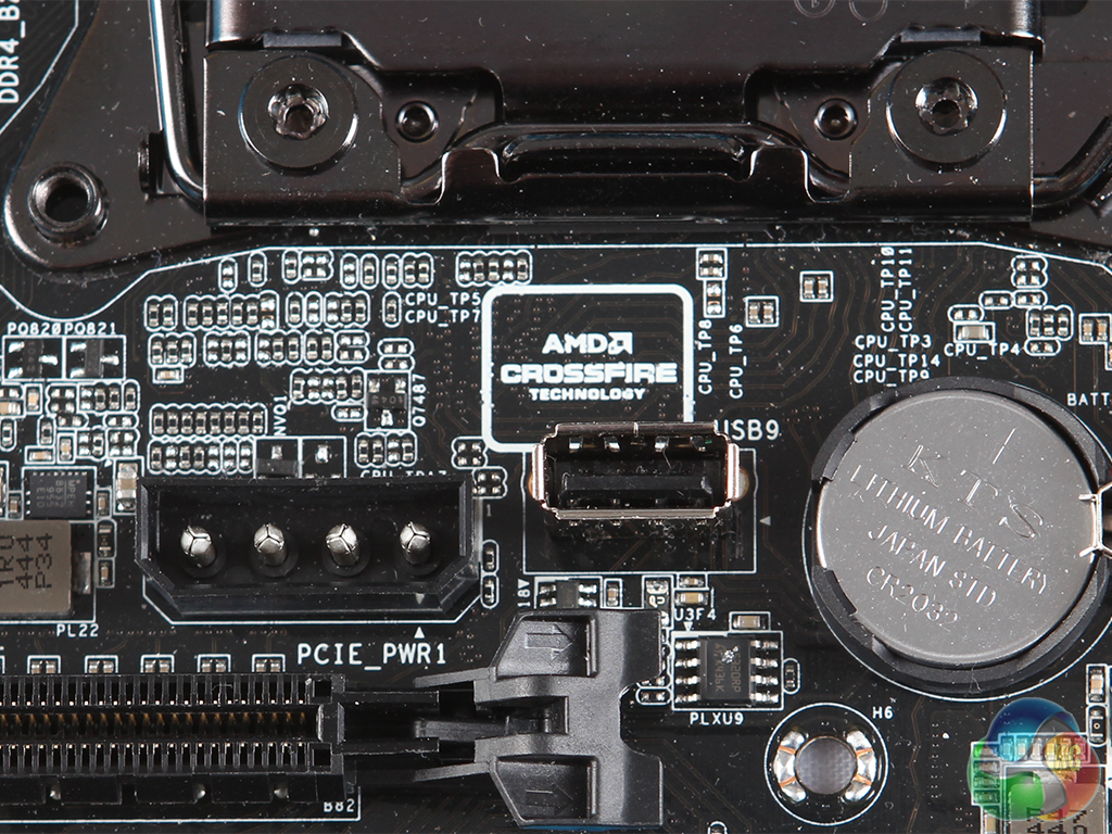 Adjacent is a standard four-pin power connector for adding extra input when lots of graphics cards are installed, and an internal USB port for a Disk on Module (DOM). A Clear CMOS jumper is found here too.