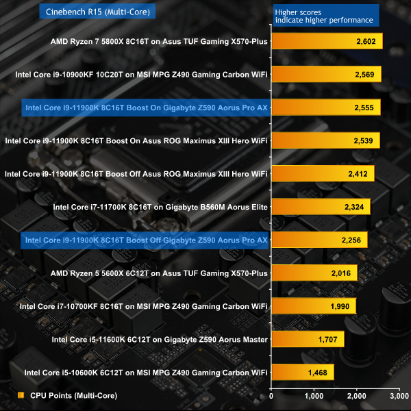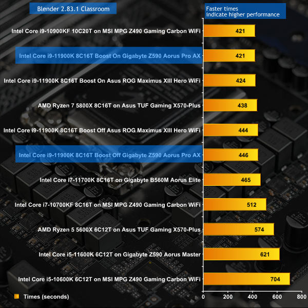 We have previously covered the performance of Core i9-11900K and there is no need to go over the same ground again in great detail. Eight cores of Intel 11th Gen is just about on par with ten cores of Intel 10th Gen and can generally beat eight cores of AMD Ryzen 7 5800X. In this particular review we are are interested in learning how well the Gigabyte Z590 Aorus Pro AX supports Intel Core i9-11900K compared to the significantly more expensive Asus ROG Maximus XIII Hero Wi-Fi that we used in our launch review of Intel Rocket Lake.