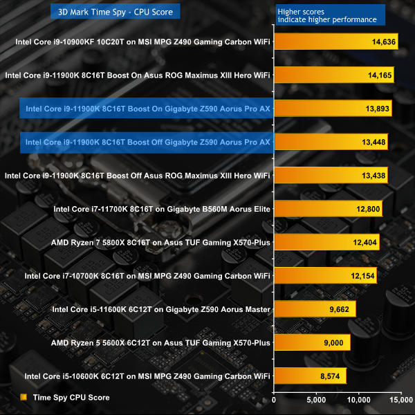 We know full well the limiting factor at 4K is the GPU however at 1440p you can see the effect of the CPU on frame rate. The synthetic Time Spy test shows the Core i9-11900K works well on the Gigabyte Z590 board although Asus delivers even better results. You will also note the previous generation Core i9-10900K tops the charts.