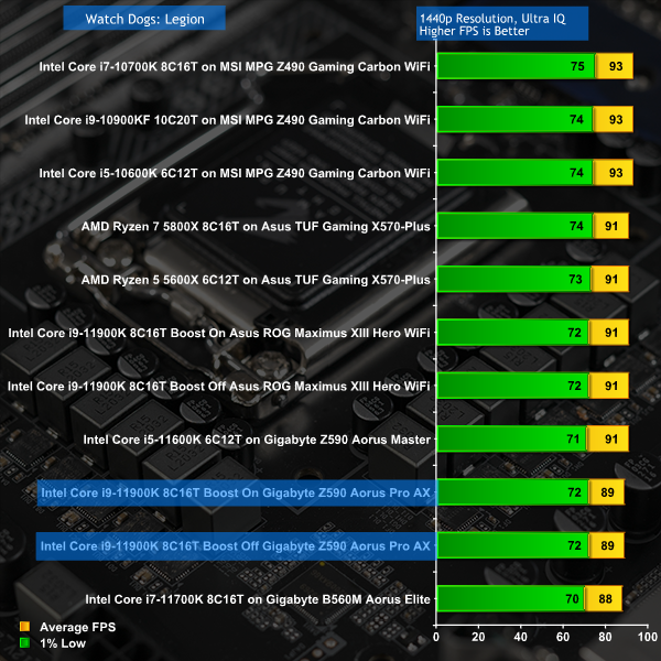 With Far Cry 5 New Dawn we can see the CPUs and motherboards that were tested most recently top the charts and directly behind them you find the Core i9-11900K on the Asus. And then we come to Watch Dogs: Legion which delivers results that are pretty much the opposite of what we see with Far Cry 5 New Dawn.