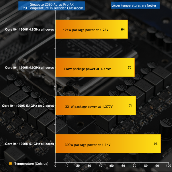 Admittedly we are using a 360mm liquid cooler but the fact is the Core i9-11900K runs nice and cool on the Gigabyte when the CPU is drawing over 200W and running at 4.9GHz. Enabling Adaptive Boost and pushing the CPU to 5.1GHz is the point where we cry ‘enough' as we cannot tolerate a continuous CPU temperature north of 90 degrees.