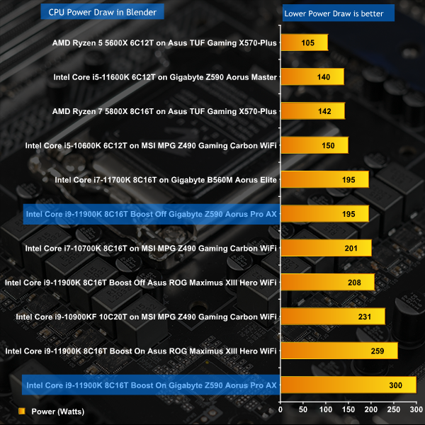 Running on Auto, we see that Core i9-11900K makes significant demands on whichever motherboard you choose, however when you enable Intel Adaptive Boost the Gigabyte uses significantly more power than the Asus. To our way of thinking, It is little short of outrageous that an eight core CPU might use 300W.