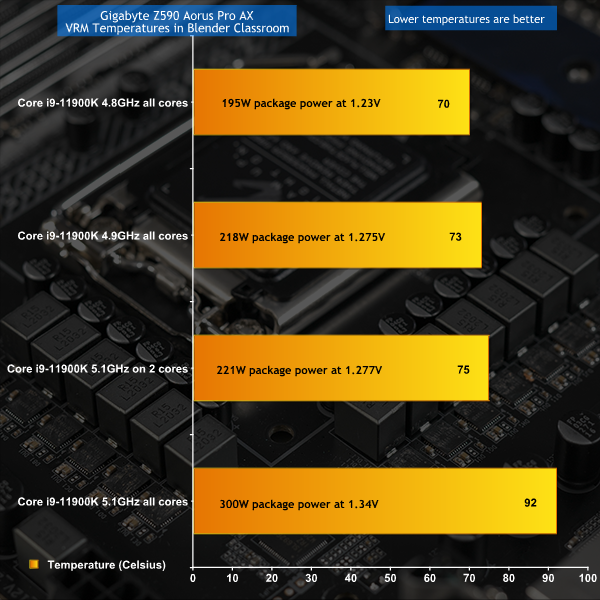 It is a similar story with VRM temperatures as they run at pretty much the same level as the CPU, although you have a wider safety margin and could – if you wish – push them past 100 degrees C with some confidence. On the other hand when you run the CPU at 4.9GHz the VRM temperatures are 75 degrees or lower, and that is absolutely fine by us.