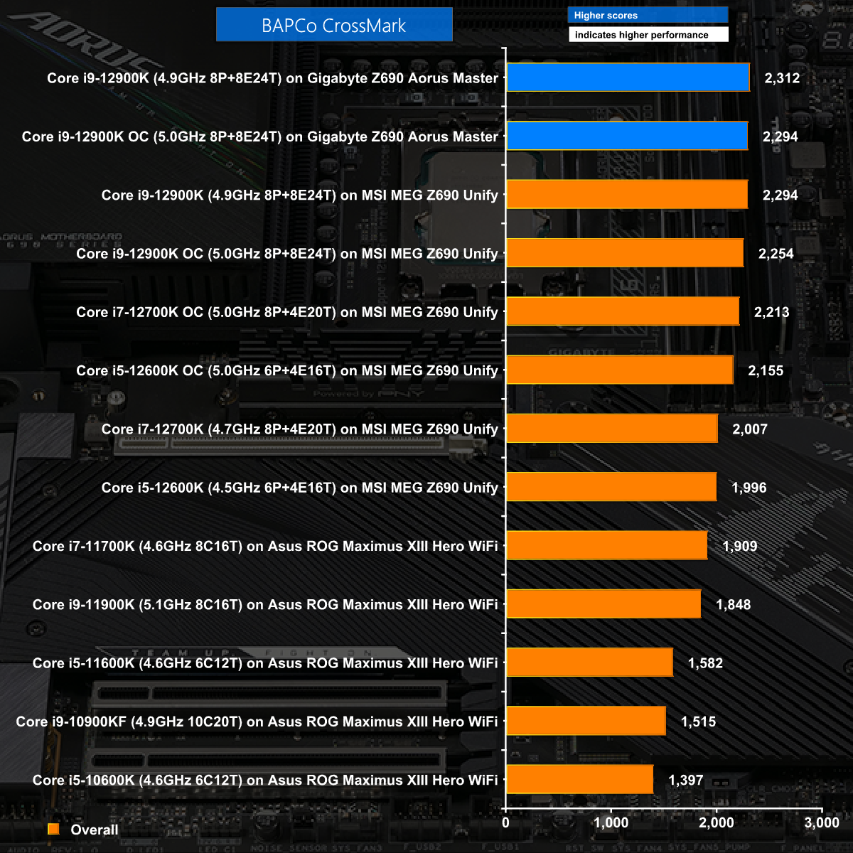 BAPCo CrossMark delivered good results for the Gigabyte Z690 Aorus Master however it only beat the MSI MEG Z690 Unify by the tiniest of margins.