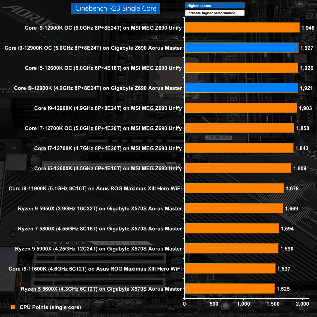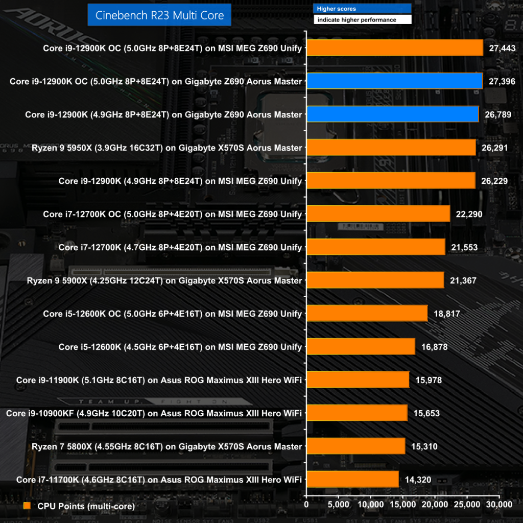 In Cinebench R23 Multi the Gigabyte Z690 Aorus Master fully supports the Core i9-12900K with the P cores running at 4.9GHz and the E cores at 3.7GHz on Auto.