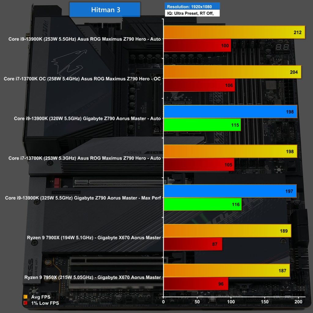 In Hitman 3 we see a reversal of fortunes as the Gigabyte Z790 Aorus Master is soundly beaten by the Asus ROG Maximus Z790 Hero.