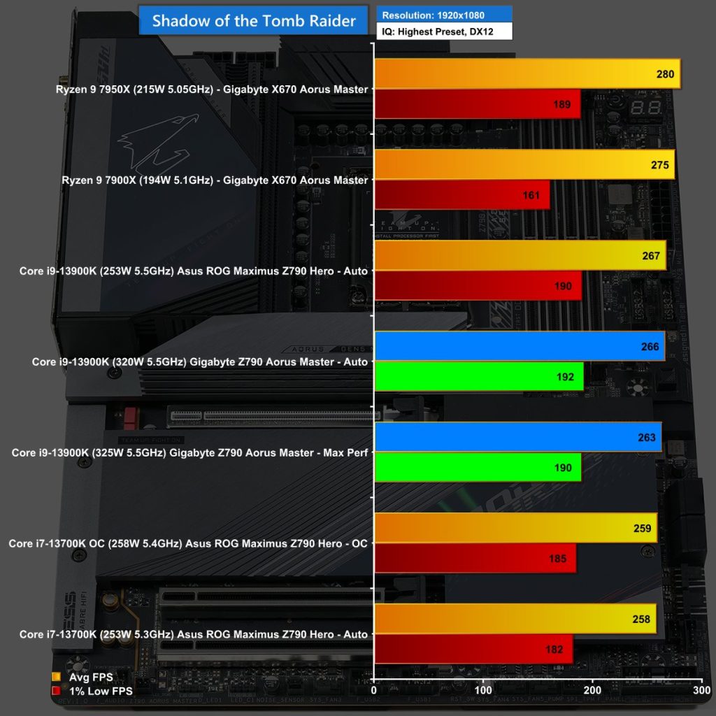 Shadow of the Tomb Raider is an oldie but a goodie and delivers an effective tie between the Gigabyte Z790 Aorus Master and Asus ROG Maximus Z790 Hero.