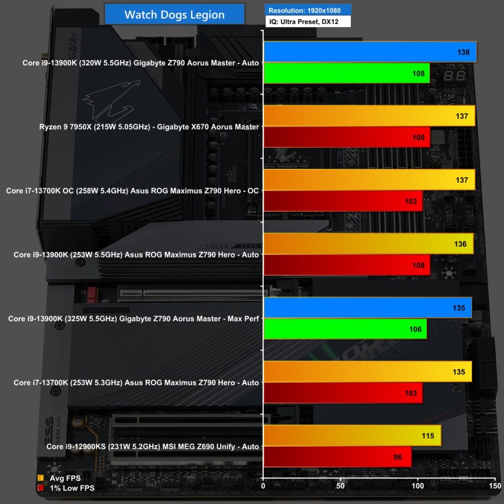 In Watch Dogs Legion it is tough to separate one high-end CPU from another, however we are declaring the Gigabyte Z790 Aorus Master as the winner by a single frame per second.