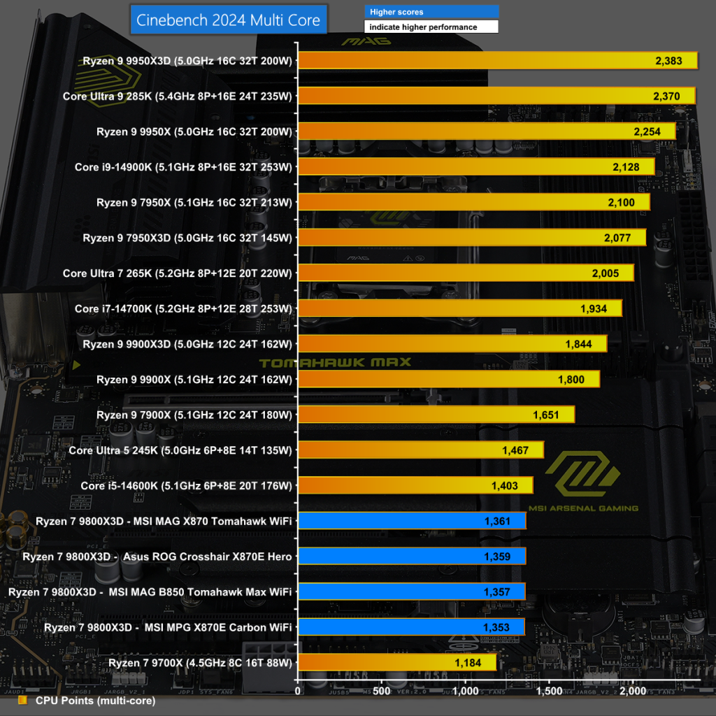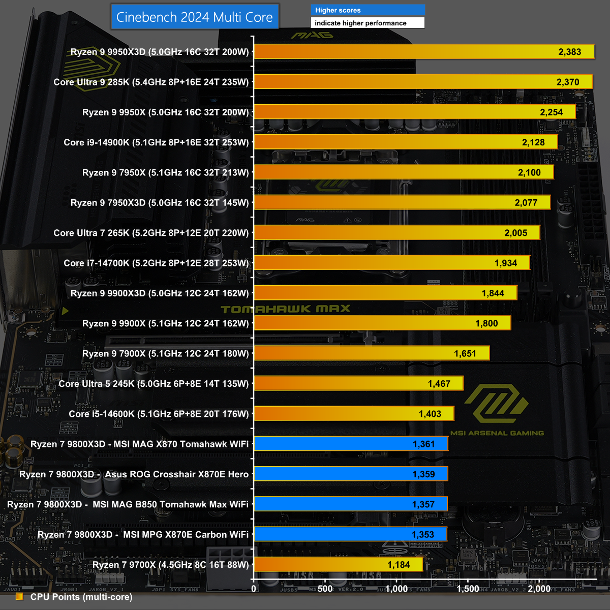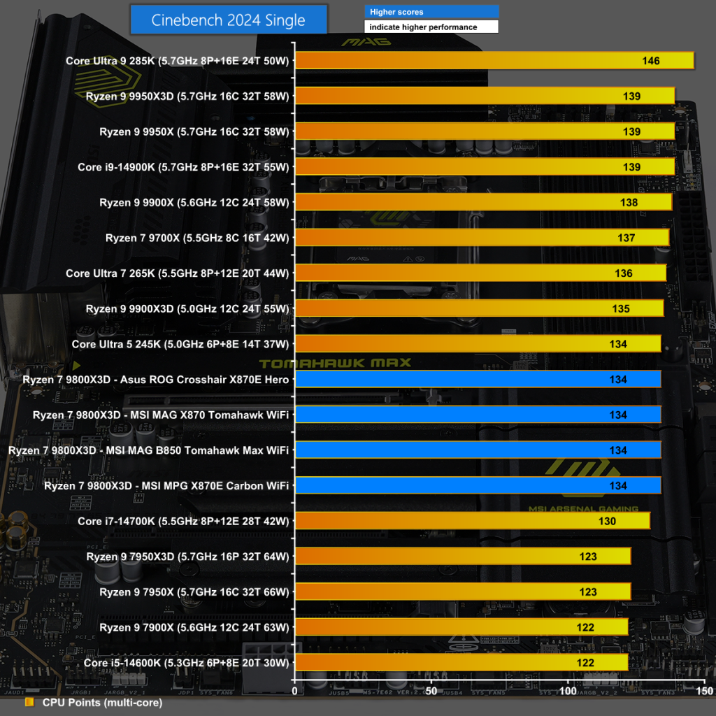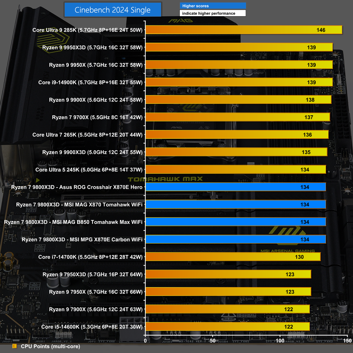 In Cinebench 2024 Multi Core we see mediocre performance from Ryzen 7 9800X3D as it gets trounced by processors with 12, 16 and more cores. The important point for this review is that the four blue bars representing different AMD AM5 motherboards are all very similar and the MSI MAG B850 Tomahawk Max WiFi does a good job.