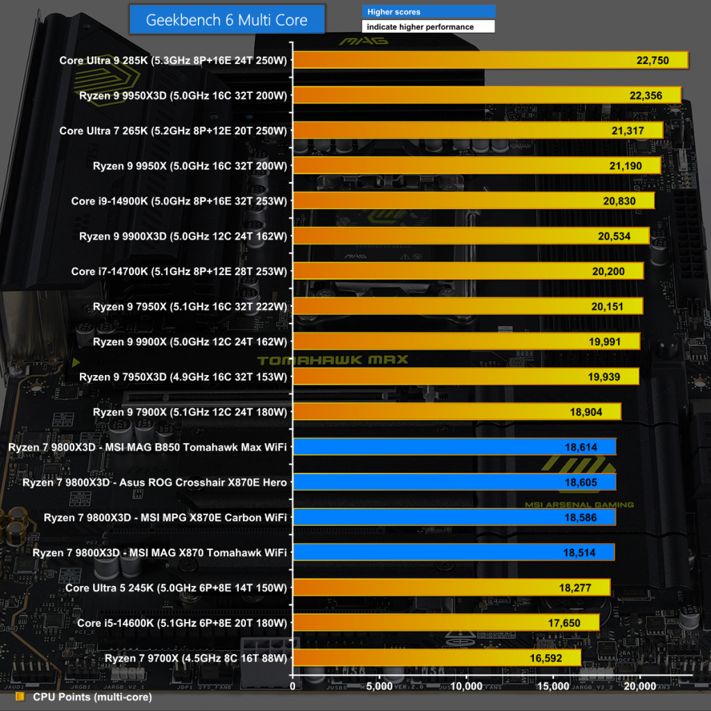 In Geekbench 6 Multi Core the four blue bars are packed together with the MSI MAG B850 Tomahawk Max WiFi taking a narrow win over the competition.